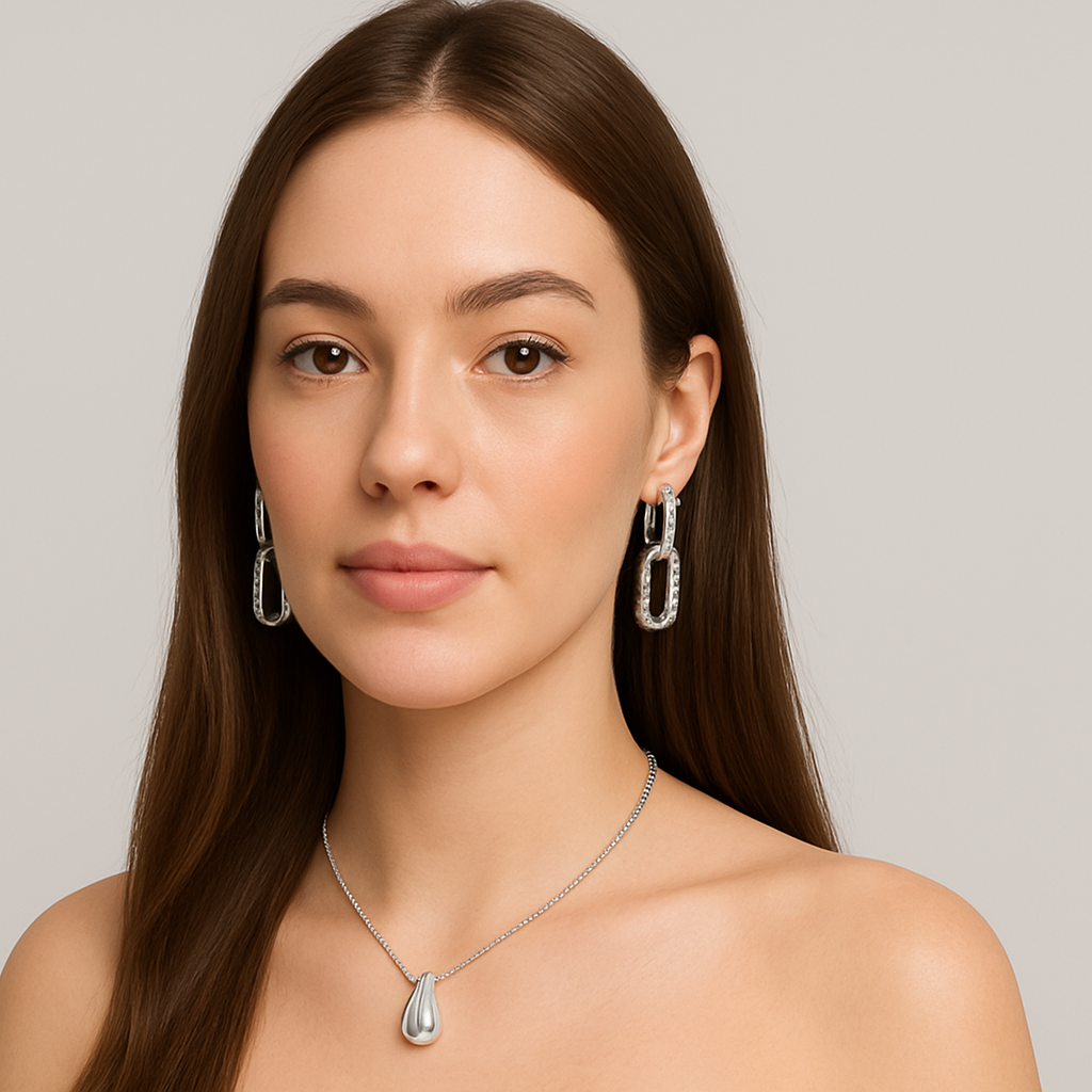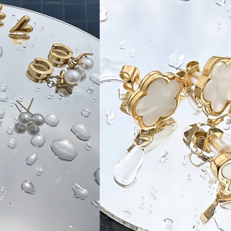 Our pieces are 18K gold plated, stainless steel, hypoallergenic, waterproof, and non-tarnish. Designed for sensitive skin and built to last, these pieces shine through showers, workouts, and beach days without losing their sparkle. Beauty meets durability, so you can wear your favorites all day, every day — worry-free.